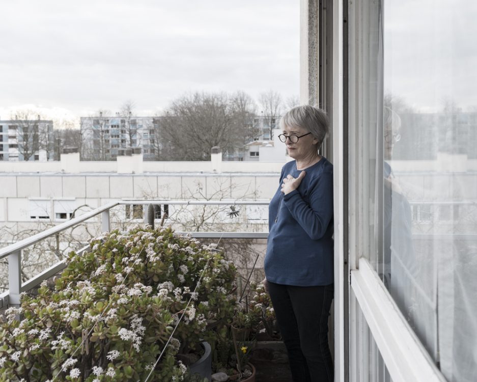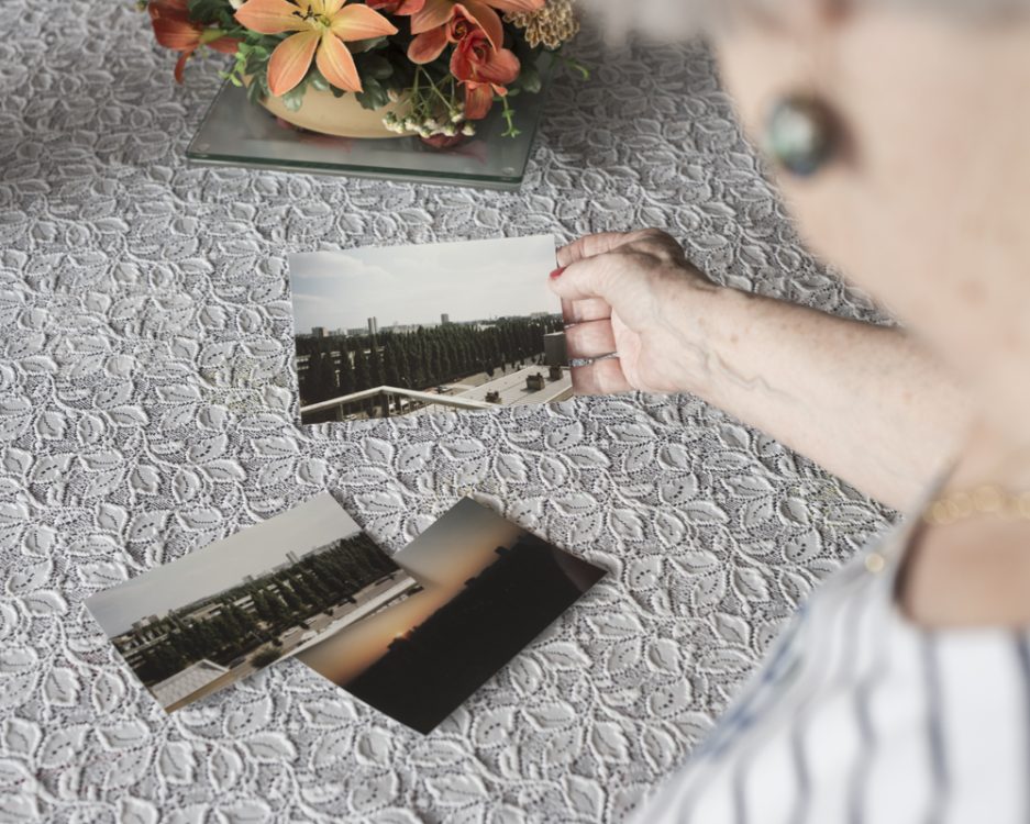 Une main délicate tient une photo. Deux autres sont posées sur la nappe brodée blanche. En bord d’image, dans un léger flou, la rondeur du visage soulignée par celle de la perle grise d’une boucle d’oreille introduit le corps de la photographe. Marcelle a 85 ans. Vers 1981, peu après son installation square du Dauphiné, elle a pris ces photos de l’université Rennes 2 vue de son balcon, par-delà l’avenue Gaston Berger. Depuis 1967, elle habitait avenue Winston Churchill. La construction de la ZUP Villejean avait débuté quelques années plus tôt. Le 17 mai 2019, Marc Loyon a passé un moment dans l’appartement de Marcelle. Elle lui a montré ces photos. Mise en abîme d’un projet. Dans le cadre de sa résidence artistique, Marc Loyon souhaitait photographier le quartier de Villejean, l’université implantée depuis 1969, les habitant.e.s et les étudiant.e.s. Tracer un lien, à travers les images, entre les différents lieux d’activités et de vie du quartier : d’un milieu à l’autre.