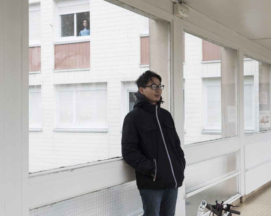 A delicate hand holds a photograph. Two others rest on the white embroidered tablecloth. At the edge of the image, slightly blurred, the roundness of the face emphasised by the grey pearl of an earring introduces the photographer’s body. Marcelle is 85 years old. Around 1981, shortly after moving to Square du Dauphiné, she took these photos of Rennes 2 University from her balcony, across Avenue Gaston Berger. She had been living on Avenue Winston Churchill since 1967. Construction of the Villejean ZUP (urban development zone) had begun a few years earlier. On 17 May 2019, Marc Loyon spent some time in Marcelle’s flat. She showed him these photos. A mise en abîme of a project. As part of his artistic residency, Marc Loyon wanted to photograph the Villejean neighbourhood, the university established there since 1969, the residents and the students. He wanted to use images to trace a link between the different places of activity and life in the neighbourhood: from one environment to another.